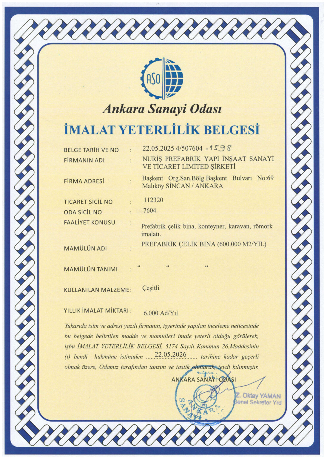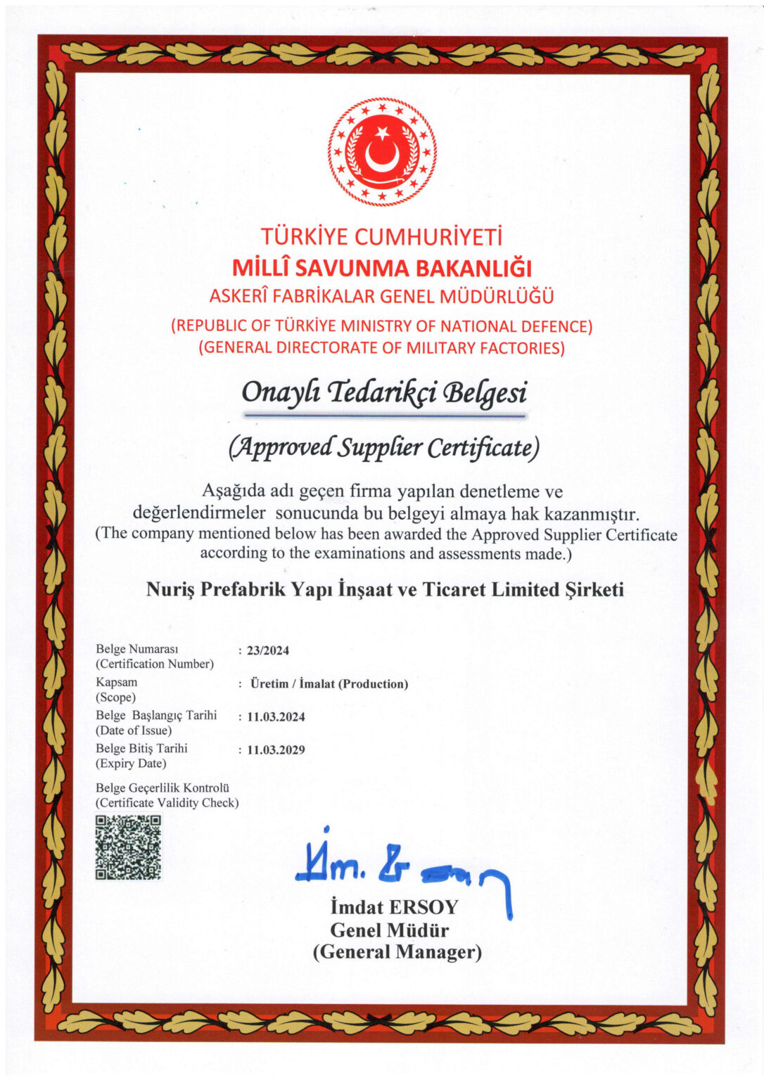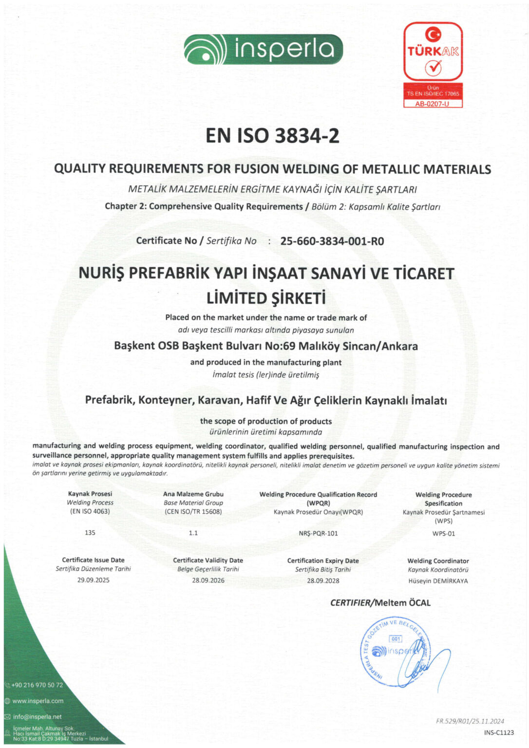 Nuriş Prefabrik, üretim ve hizmet süreçlerinde ulusal ve uluslararası standartlara uygunluğunu belgeleyen sertifikalarla kalite, güven ve sürdürülebilirlik anlayışını resmi olarak tescillemektedir. Sahip olduğumuz sertifikalar, prefabrik yapı, konteyner sistemleri ve çelik konstrüksiyon üretimi alanındaki yetkinliğimizi ve kurumsal güvenilirliğimizi yansıtmaktadır.
