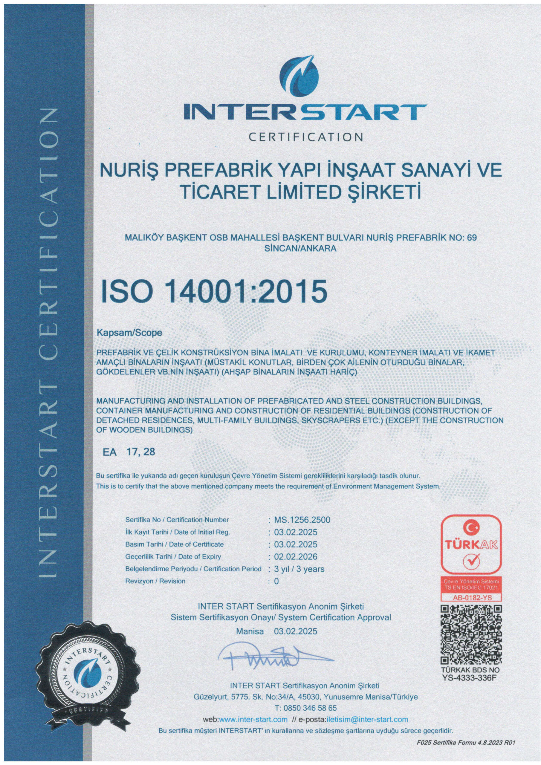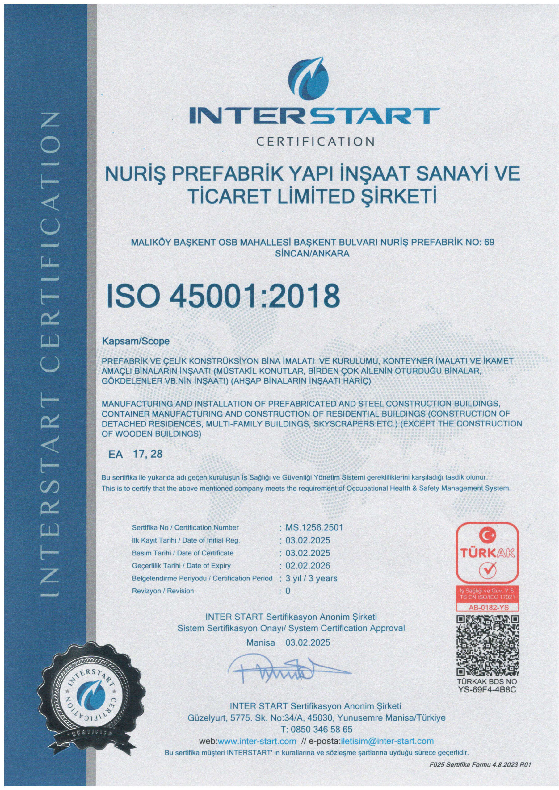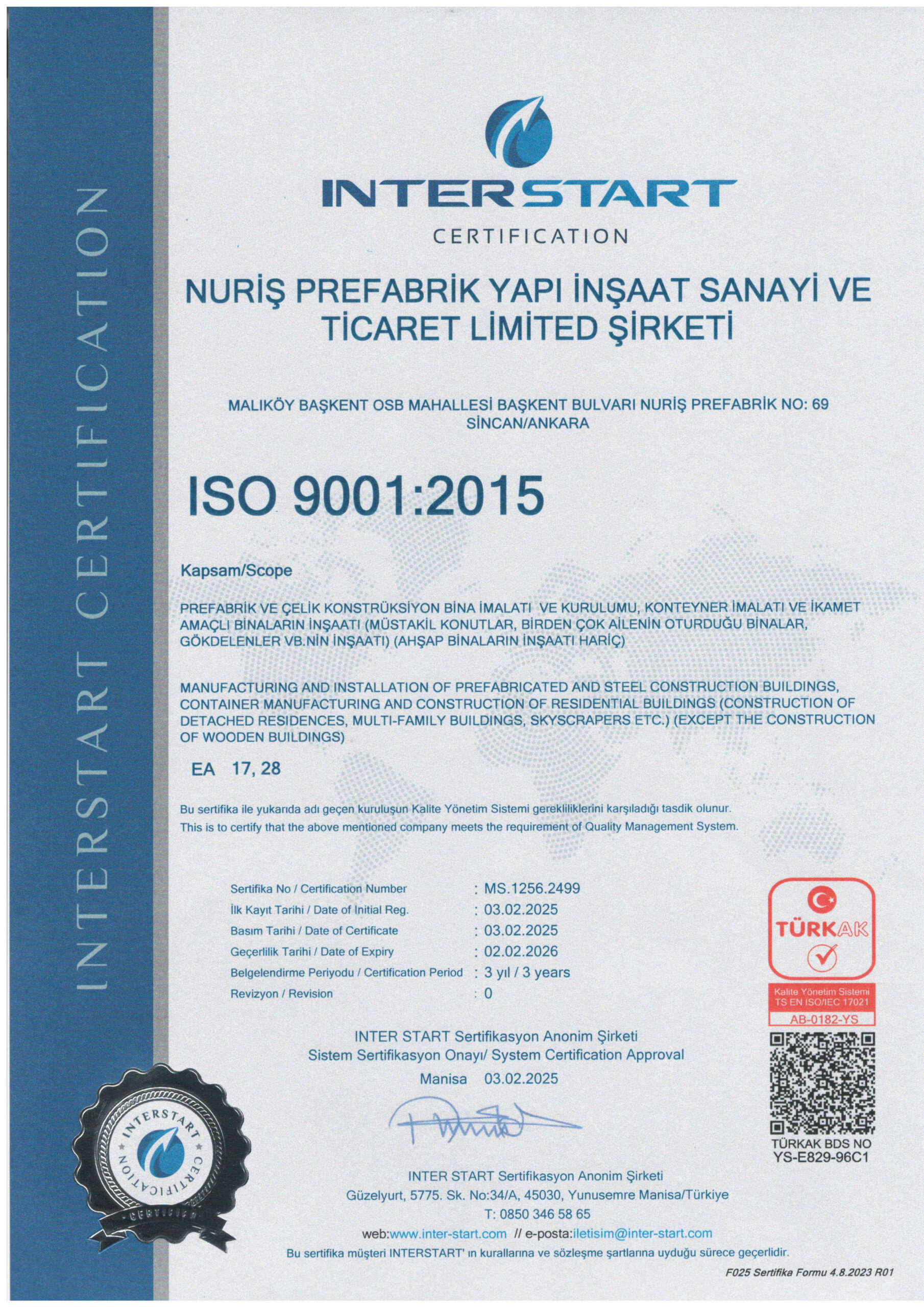 Nuriş Prefabrik, üretim ve hizmet süreçlerinde ulusal ve uluslararası standartlara uygunluğunu belgeleyen sertifikalarla kalite, güven ve sürdürülebilirlik anlayışını resmi olarak tescillemektedir. Sahip olduğumuz sertifikalar, prefabrik yapı, konteyner sistemleri ve çelik konstrüksiyon üretimi alanındaki yetkinliğimizi ve kurumsal güvenilirliğimizi yansıtmaktadır.