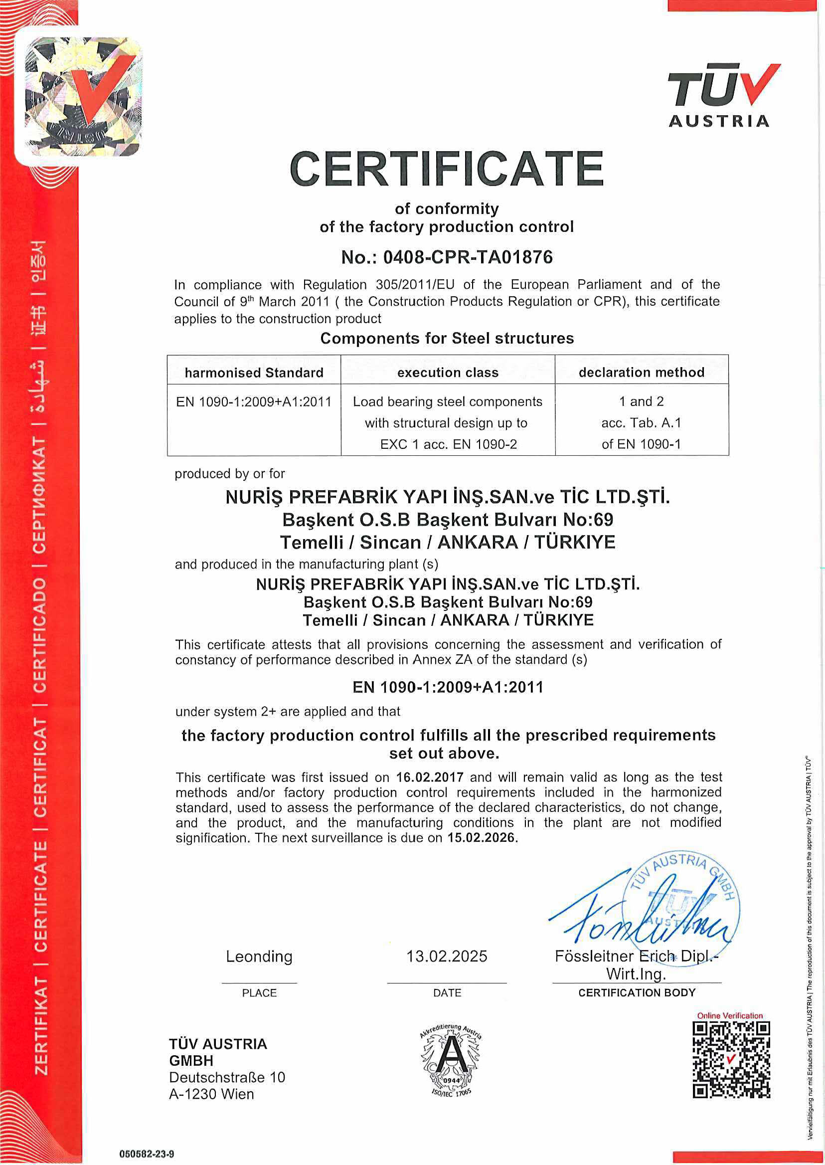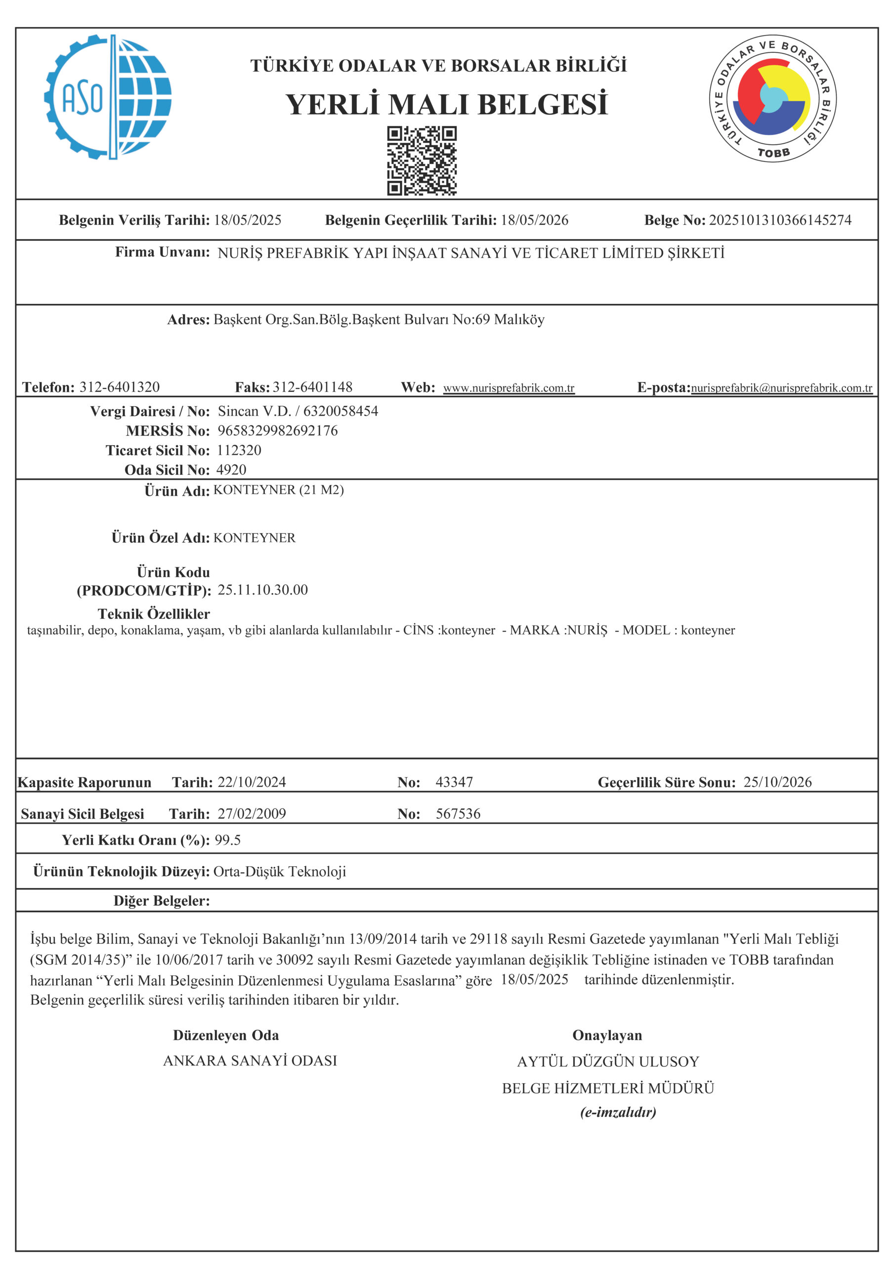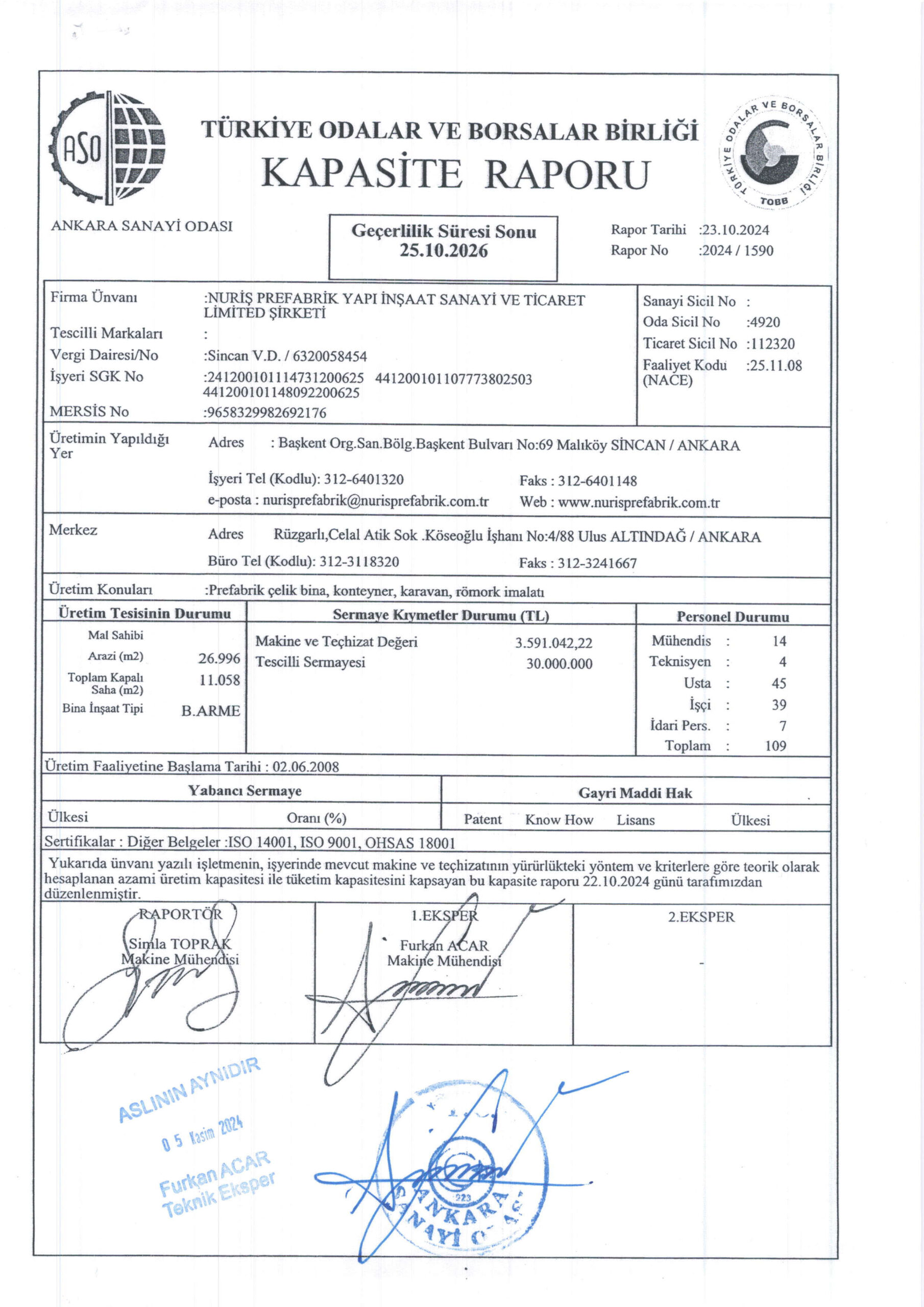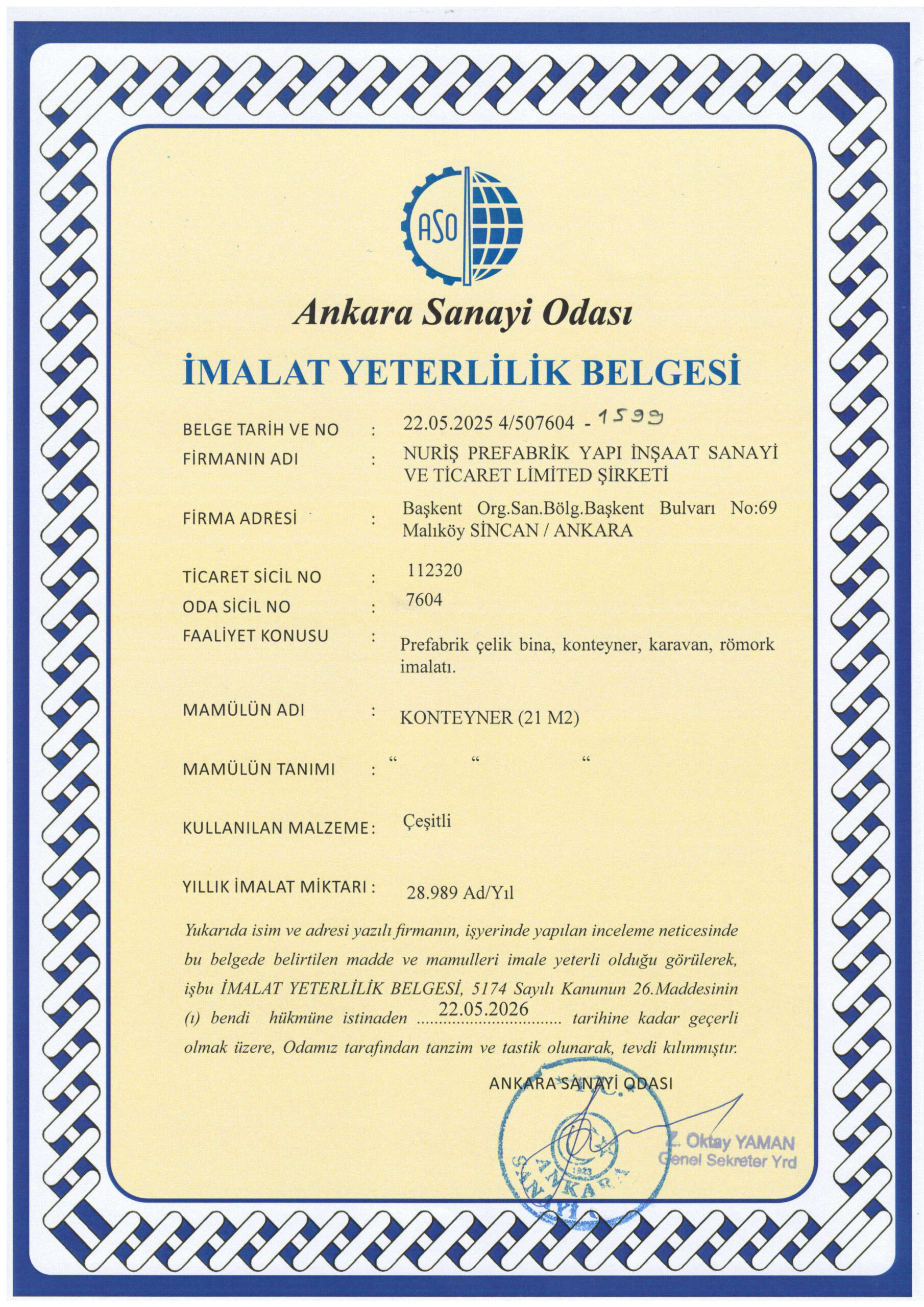Nuriş Prefabrik, üretim ve hizmet süreçlerinde ulusal ve uluslararası standartlara uygunluğunu belgeleyen sertifikalarla kalite, güven ve sürdürülebilirlik anlayışını resmi olarak tescillemektedir. Sahip olduğumuz sertifikalar, prefabrik yapı, konteyner sistemleri ve çelik konstrüksiyon üretimi alanındaki yetkinliğimizi ve kurumsal güvenilirliğimizi yansıtmaktadır.